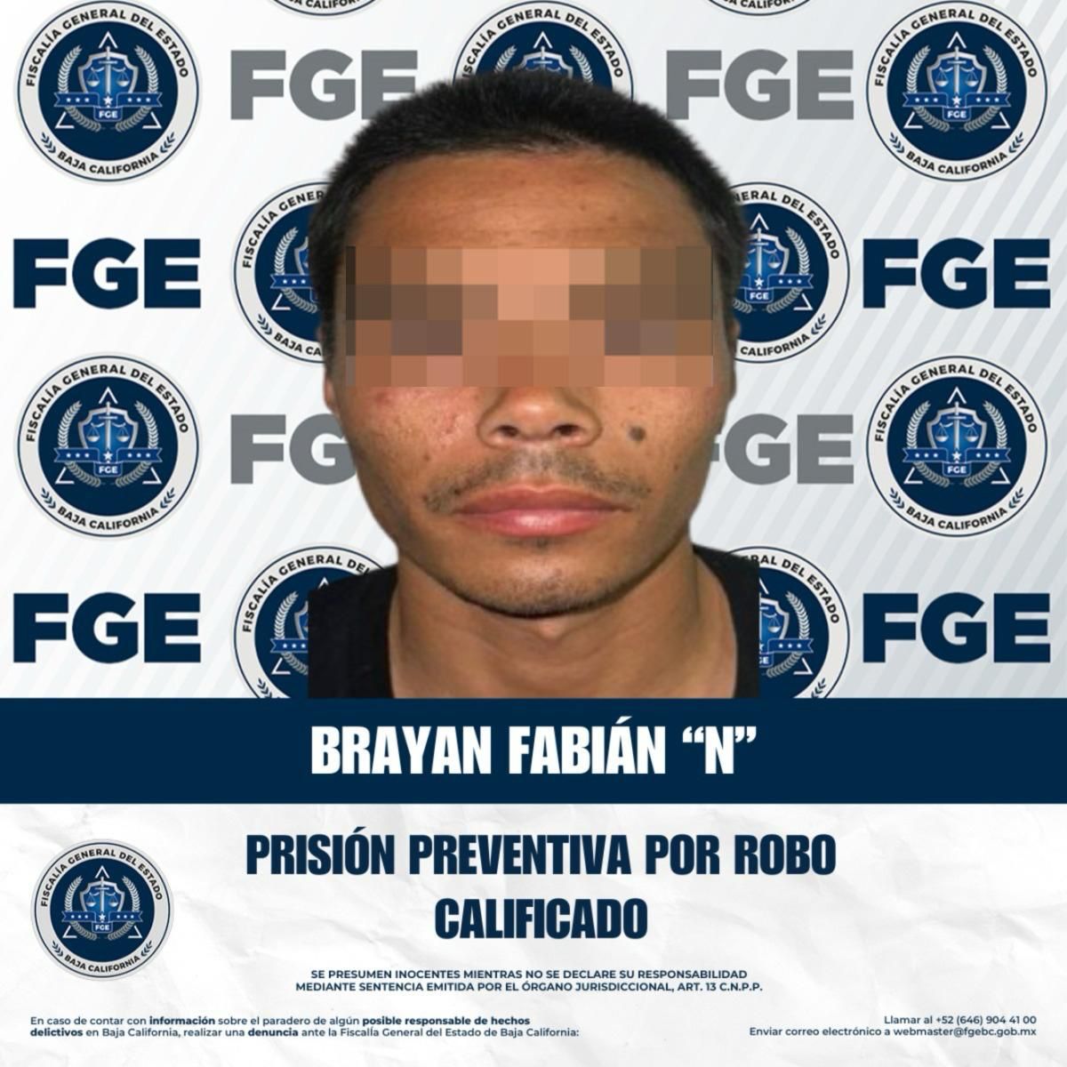 TIJUANA, Baja California a 21 de abril de 2026, La Fiscalía General del Estado, a través de la Fiscalía Regional de Tijuana, informa que se obtuvo la imposición de la medida cautelar de prisión preventiva justificada en contra de Brayan Fabián “N”, imputado por el delito de robo calificado a lugar cerrado.