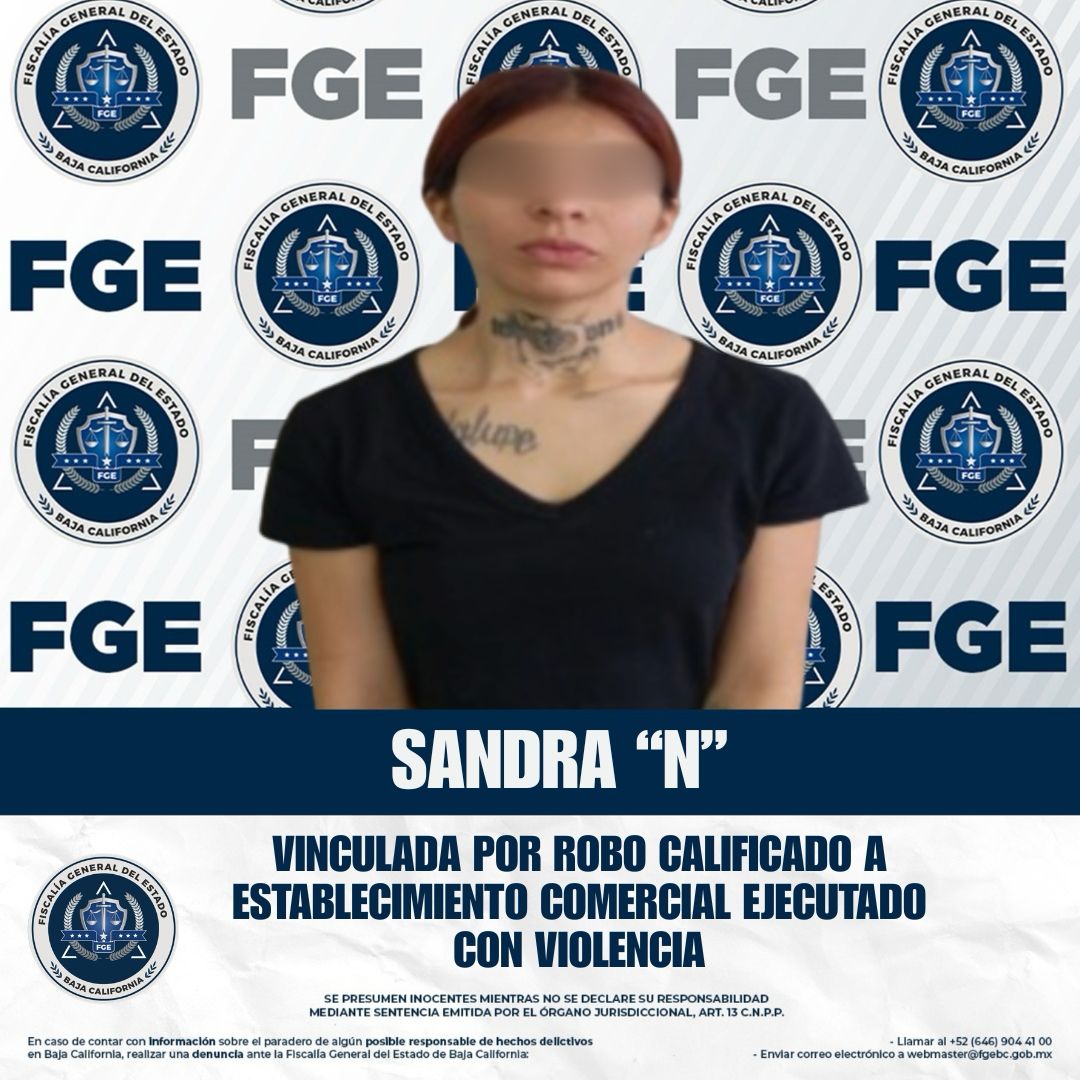 ENSENADA, Baja California a 28 de abril de 2026, La Fiscalía Regional de Ensenada, en coordinación con la Unidad de Investigación de Robos, obtuvo la vinculación a proceso de Sandra “N” por el delito de robo calificado a establecimiento comercial abierto al público, ejecutado con violencia.