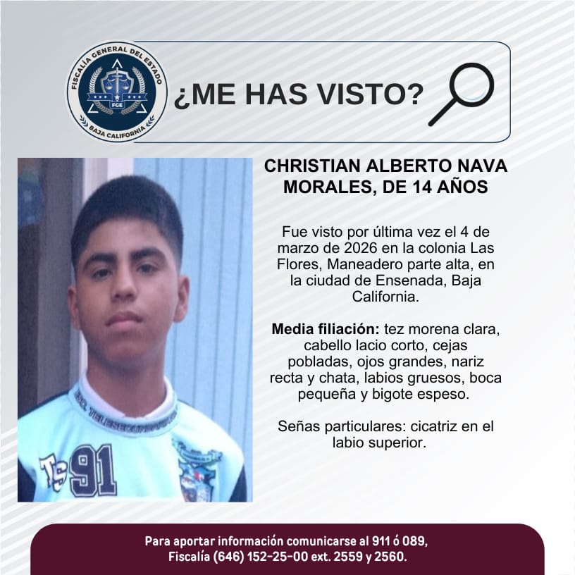 ENSENADA, Baja California, 06 de marzo del 2026.- La Fiscalía General del Estado (FGE) solicita el apoyo de la ciudadanía para la localización de Christian Alberto Nava Morales, de 14 años de edad.
