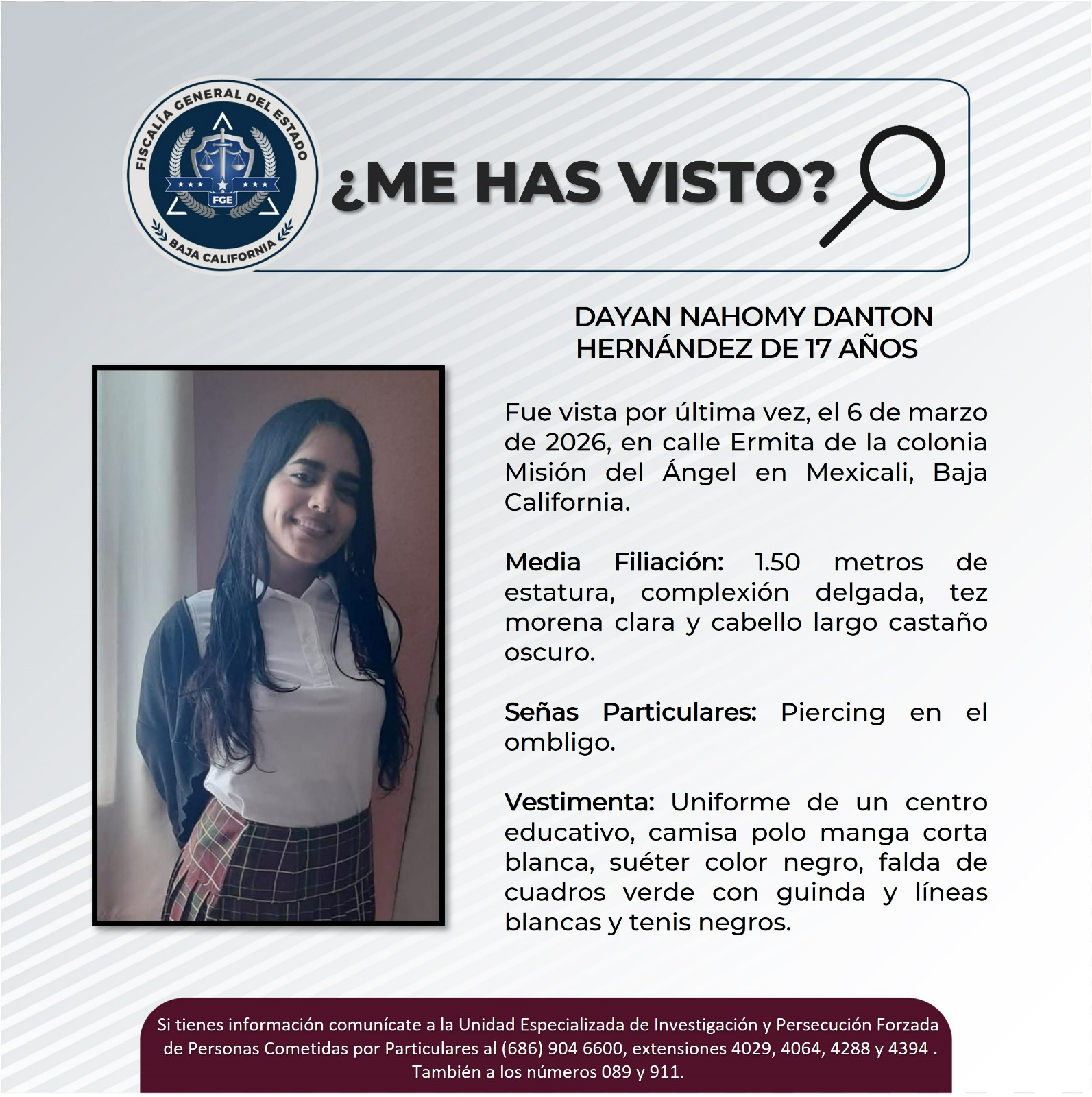 MEXICALI, Baja California, 10 de marzo del 2026.- La Fiscalía General del Estado (FGE) solicita la colaboración de la ciudadanía para la localización de Dayan Nahomy Danton Hernández de 17 años.