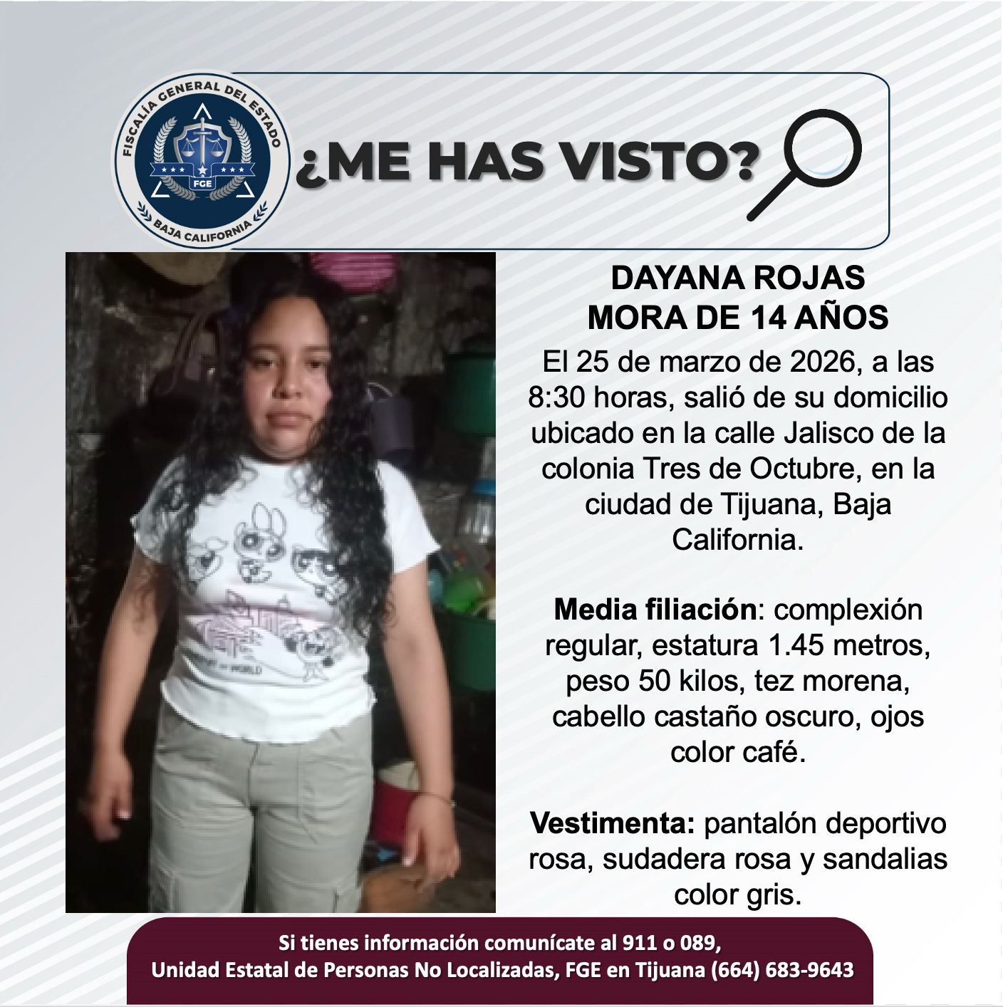 TIJUANA, Baja California, 26 de marzo del 2026.- La Fiscalía General del Estado (FGE) solicita el apoyo de la ciudadanía para localizar a Dayana Rojas Mora de 14 años de edad.