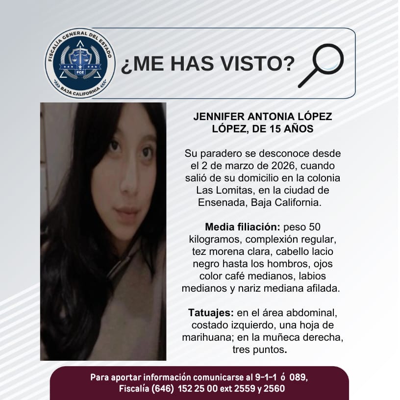 ENSENADA, Baja California, 07 de marzo del 2026.- La Fiscalía General del Estado (FGE) solicita la colaboración de la comunidad para localizar a Jennifer Antonia López López, de 15 años de edad.