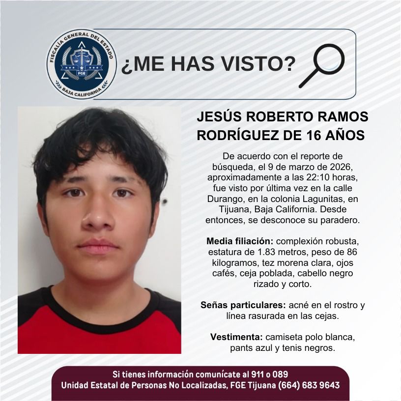 TIJUANA, Baja California, 11 de marzo del 2026.- La Fiscalía General del Estado (FGE) solicita el apoyo de la ciudadanía para la localización de Jesús Roberto Ramos Rodríguez, de 16 años de edad, quien padece trastorno depresivo recurrente.