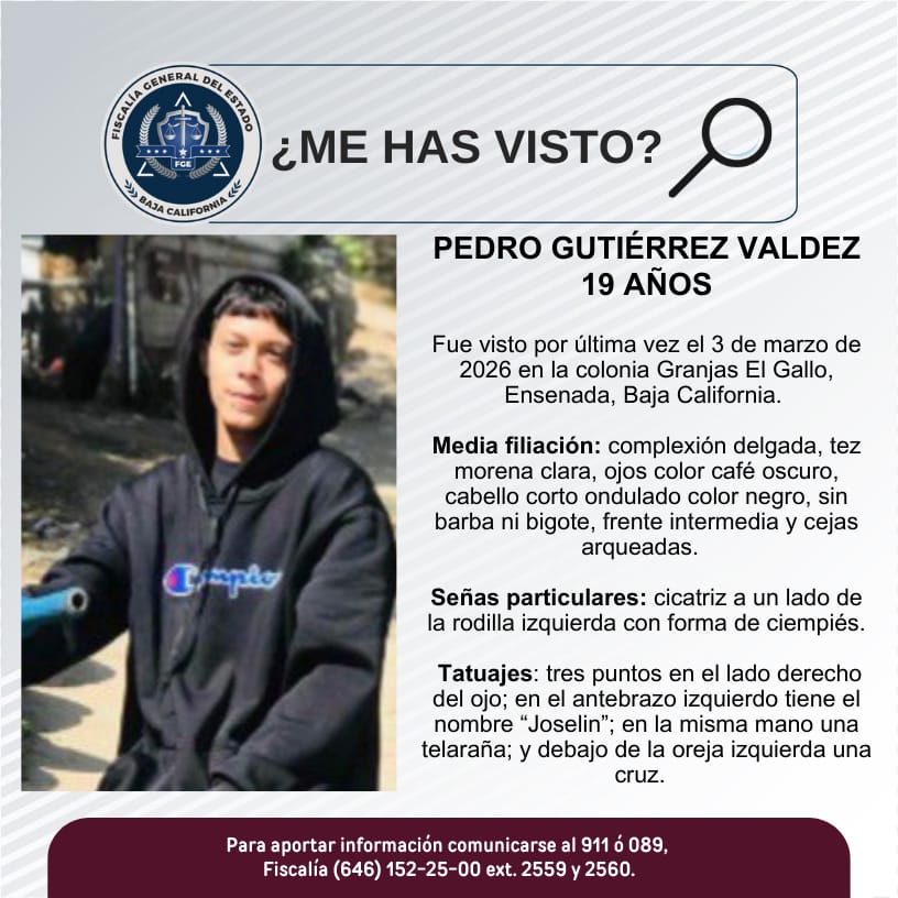 ENSENADA, Baja California, 08 de marzo del 2026.- La Fiscalía General del Estado (FGE) solicita la colaboración de la comunidad para localizar a Pedro Gutiérrez Valdez, de 19 años de edad.