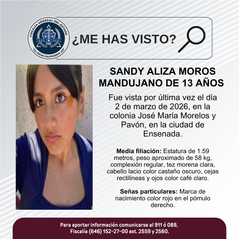 ENSENADA, Baja California, 04 de marzo del 2026.- La Fiscalía General del Estado (FGE) solicita el apoyo de la ciudadanía para la localización de Sandy Aliza Moros Mandujano de 13 años de edad.