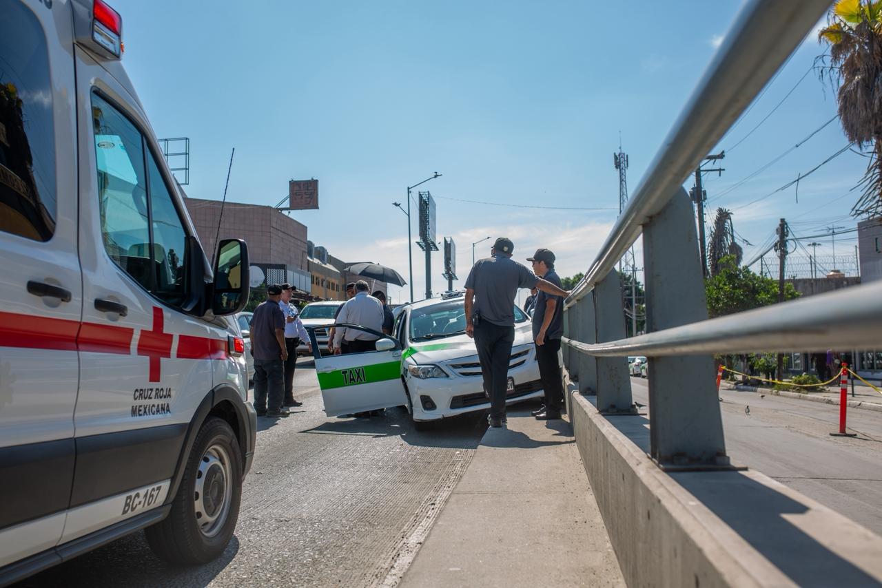 TIJUANA, Baja California a 27 de marzo de 2026, Un accidente vehicular se registró la tarde de este viernes en la salida del puente El Chaparral, en dirección hacia la línea internacional, donde un taxi libre color verde se impactó contra la estructura del puente.