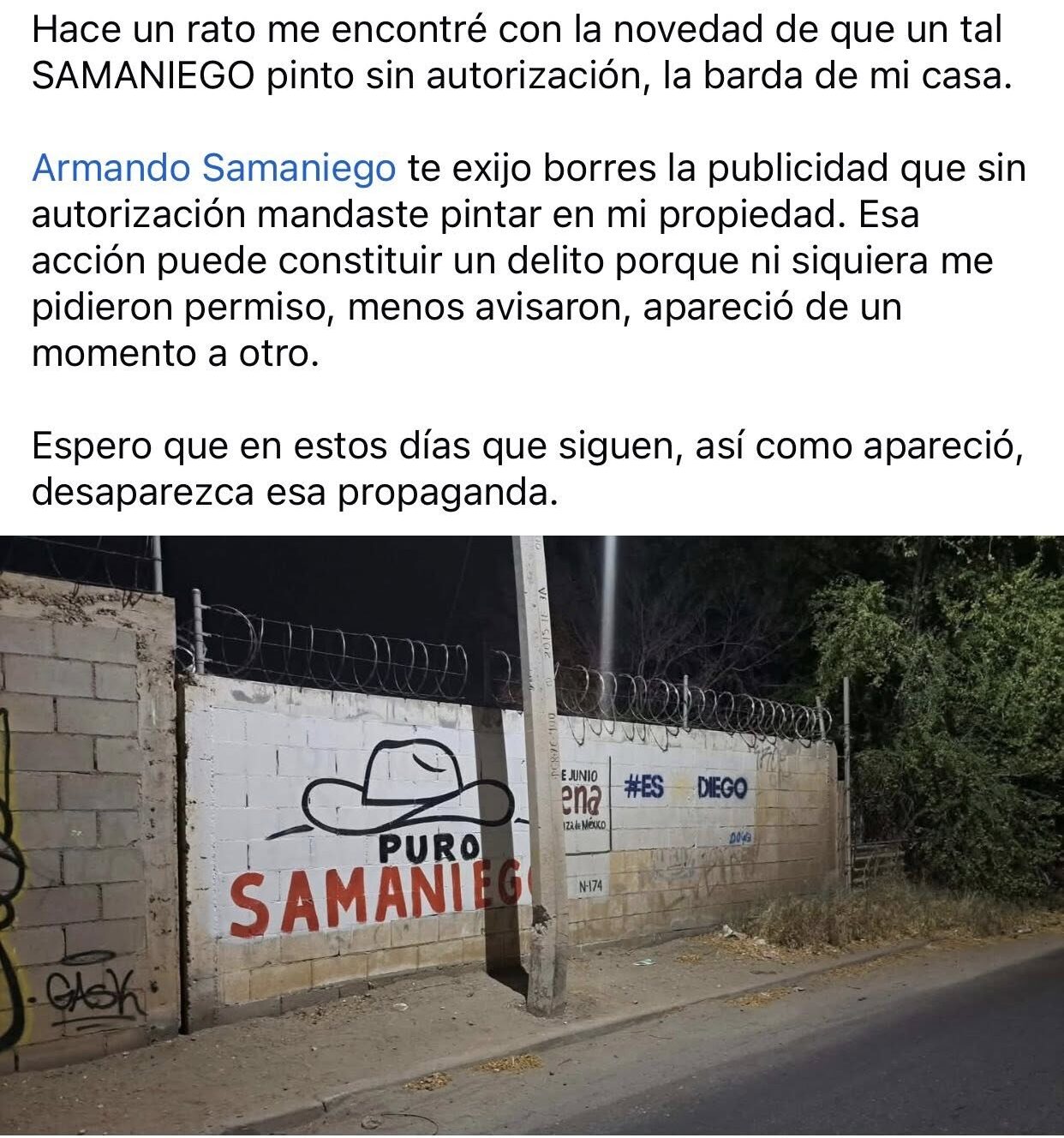 “Armando Samaniego te exijo borres la publicidad que sin autorización mandaste pintar en mi propiedad. Esa acción puede constituir un delito porque ni siquiera me pidieron permiso, menos avisaron, apareció de un momento a otro. Espero que en estos días que siguen, así como apareció, desaparezca esa propaganda”, agregó el propietario.