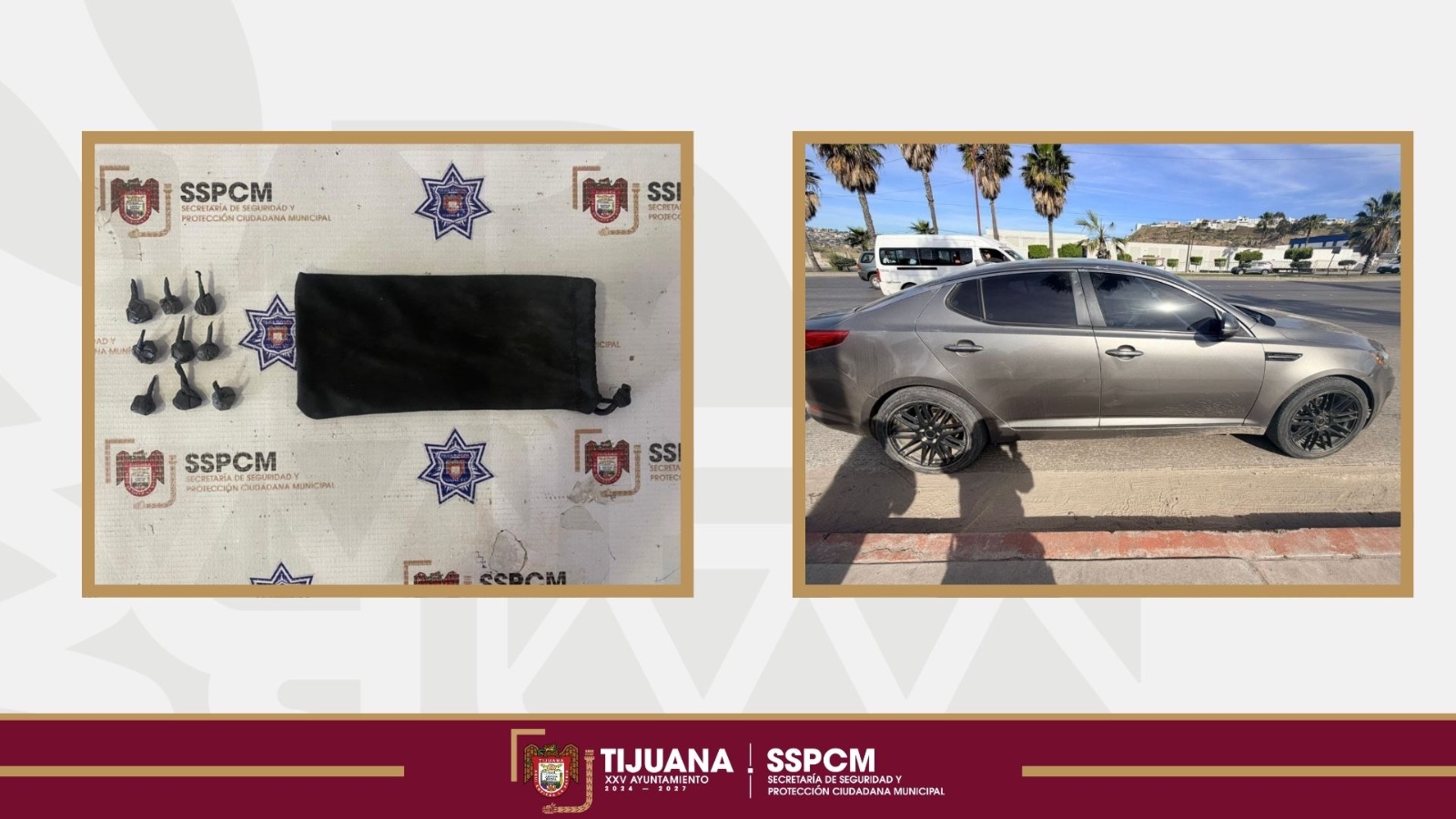 La intervención se derivó de un reporte emitido por la Central de Monitoreo, en el que se alertó sobre la detección, mediante cámaras de videovigilancia, de un vehículo tipo sedán marca Kia Optima, color gris, el cual contaba con señalamiento por su presunta relación en un hecho delictivo.