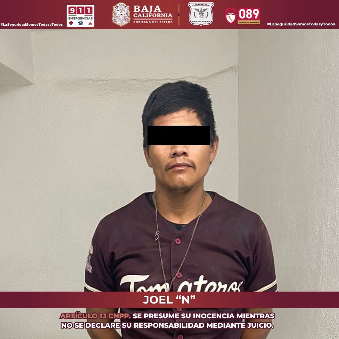 El individuo se identificó como Joel “N”, de 33 años, originario de Tecate, quien reaccionó de forma agresiva y lanzó amenazas contra los oficiales. Conforme a protocolo, se realizó una inspección corporal sin localizar objetos ilícitos.