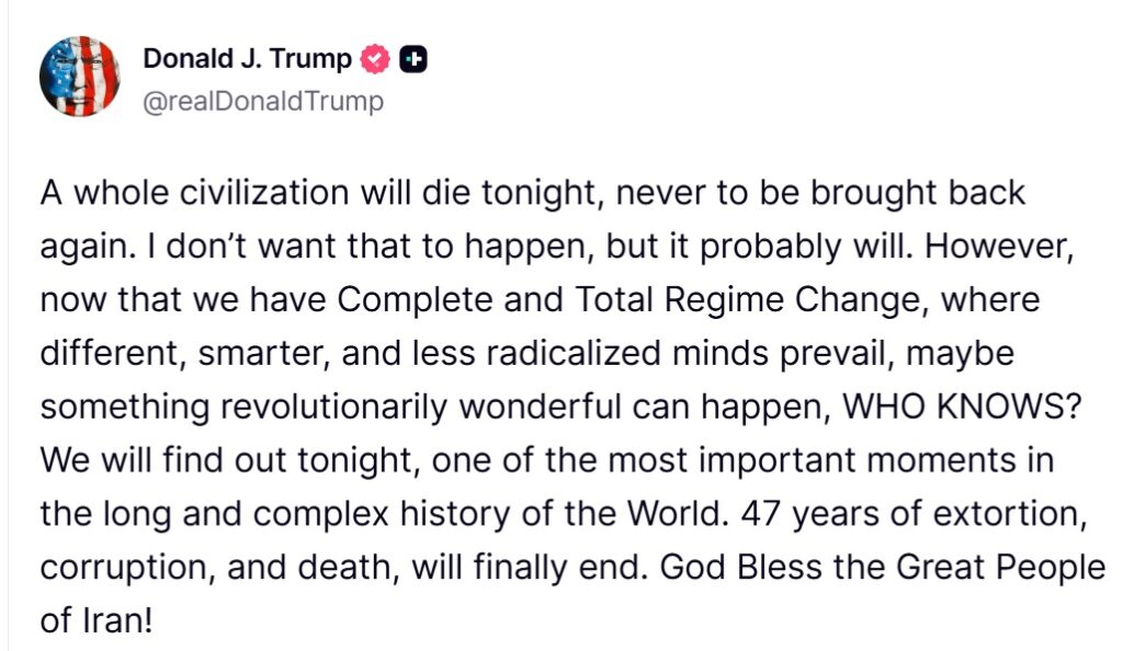 ESTADOS UNIDOS, 7 de abril del 2026.- El presidente estadounidense, Donald Trump, advirtió de que “esta noche morirá toda una civilización, para no volver jamás”, a horas de que se cumpla su ultimátum a Irán para que reabra el estratégico Estrecho de Ormuz. “No quiero que eso suceda, pero es probable que ocurra”, aseguró el mandatario en su red Truth Social.