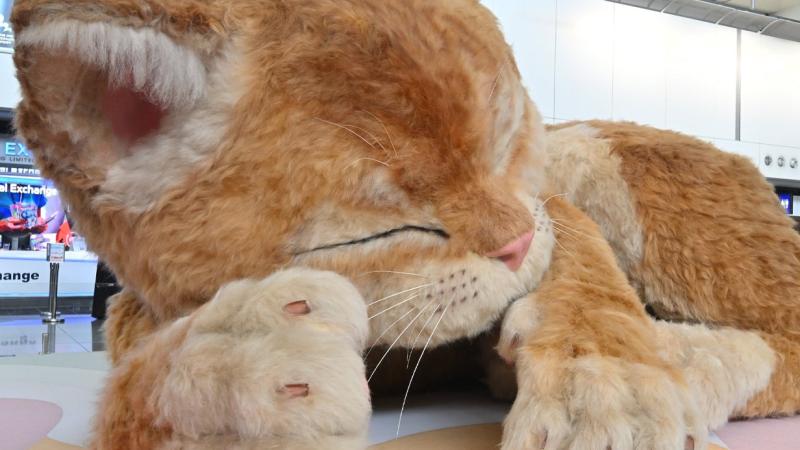 Lo que más llama la atención de los usuarios de esta terminal aérea no es solo las enormes dimensiones de este felino color naranja ni la tierna posición de una plácida siesta en la que fue acomodado, sino que ronronea y, además, mueve las orejas y la cola ante el asombro de quienes lo miran.