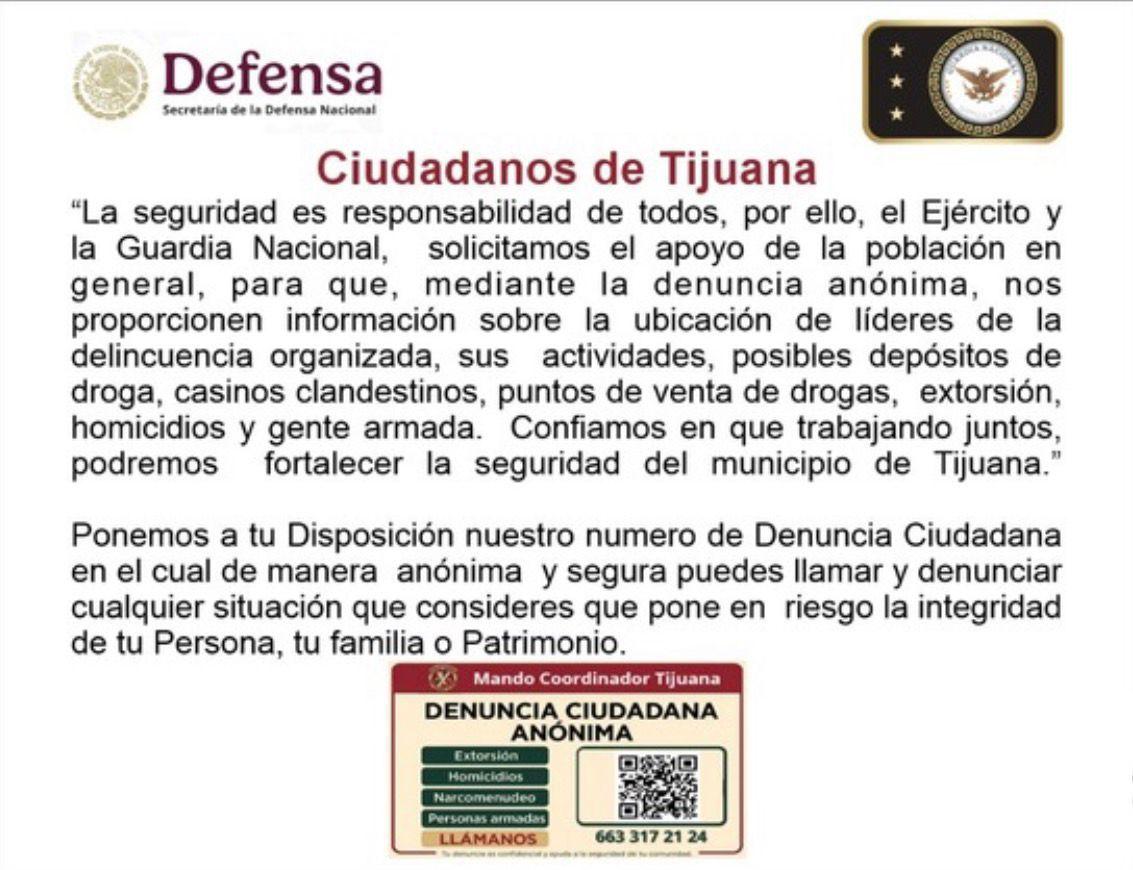 TIJUANA, Baja California, 19 de marzo del 2026.- La Guardia Nacional y el Ejército Mexicano están lanzando una campaña de denuncia ciudadana con el objetivo de combatir la delincuencia organizada en la ciudad.