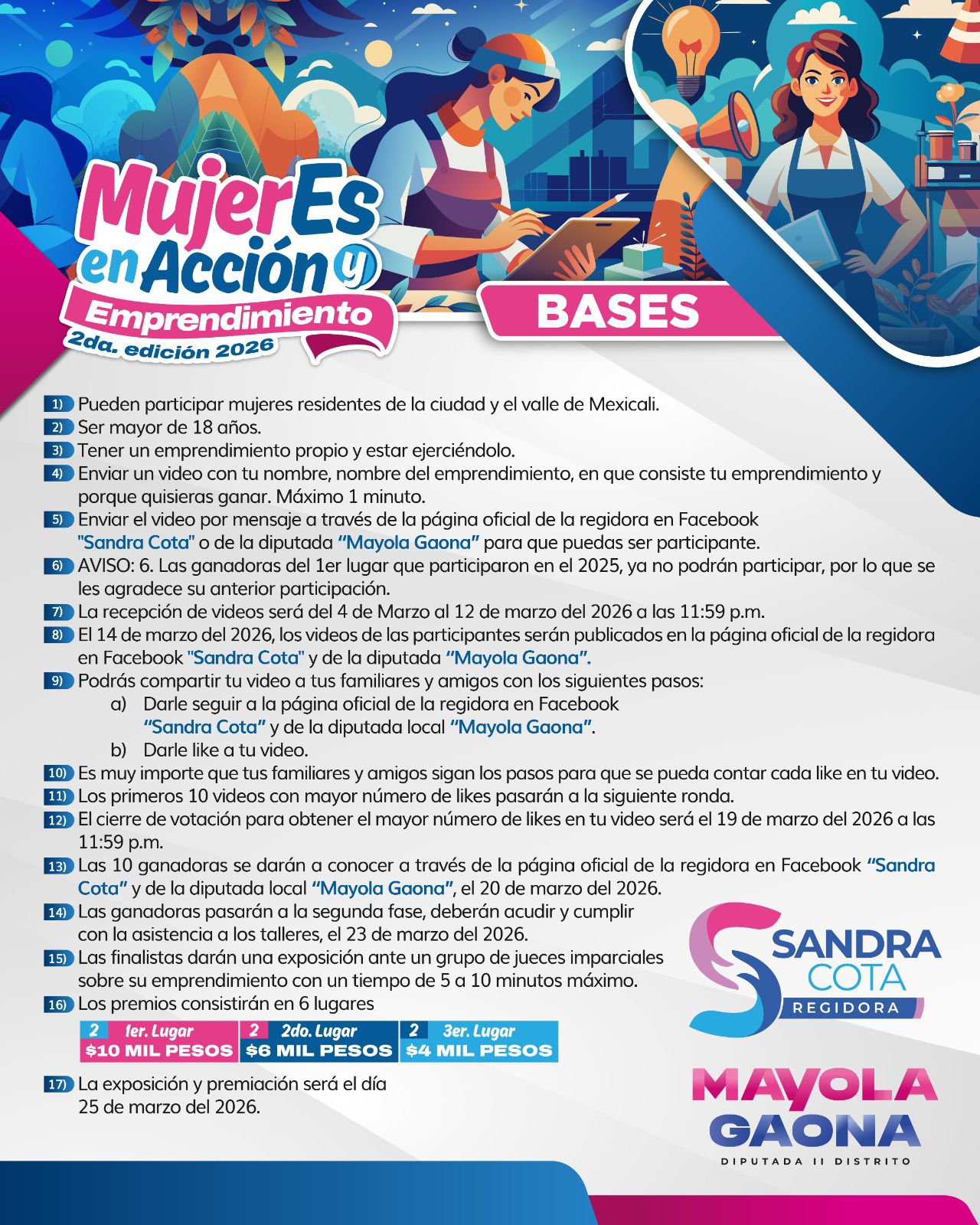 Para participar es necesario ser mujer, mayor de 18 años, residente del municipio de Mexicali, contar con un emprendimiento propio que esté activo y operando. Las interesadas deberán enviar un video de máximo un minuto de duración en el que incluyan su nombre, el nombre de su emprendimiento, en qué consiste y por qué desean ganar.