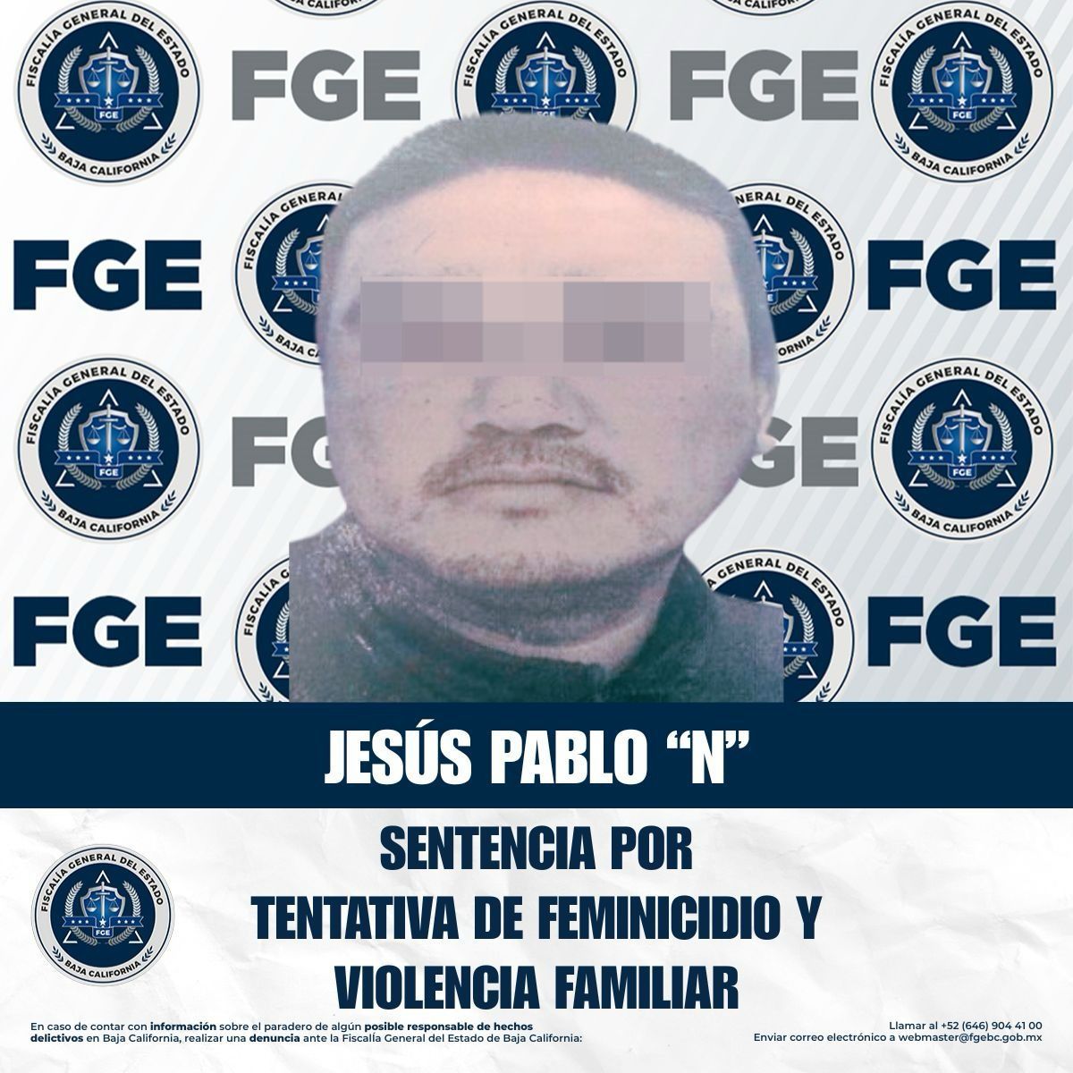 TIJUANA, Baja California a 29 de abril de 2026, La Unidad de Investigación de UTMC Zona Centro, adscrita a la Fiscalía Regional de Tijuana, obtuvo una sentencia condenatoria de 27 años y 2 meses de prisión en contra de Jesús Pablo “N”, por su responsabilidad en los delitos de feminicidio en grado de tentativa y violencia familiar.
