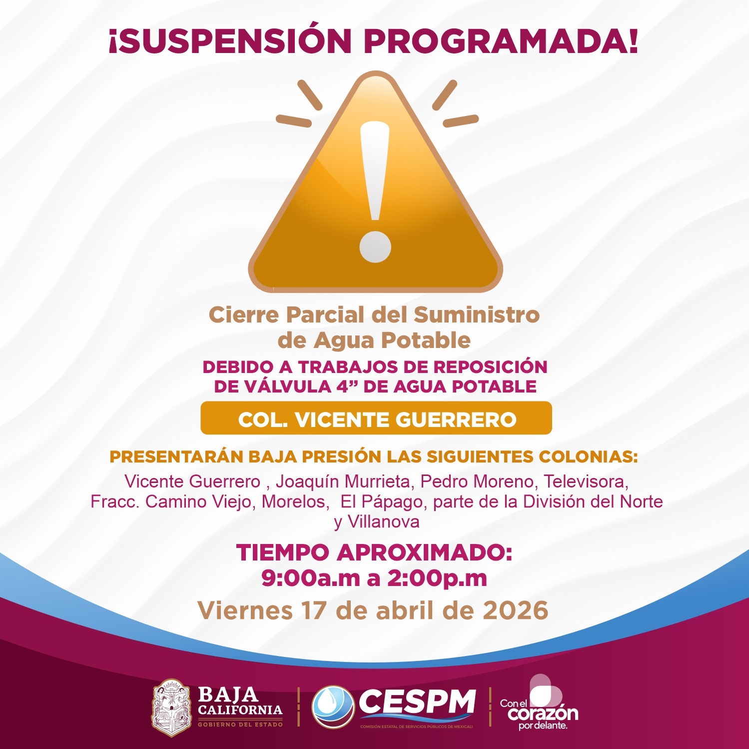 MEXICALI, Baja California, 17 de abril del 2026.- La Comisión Estatal de Servicios Públicos de Mexicali informó que 8 colonias de Mexicali permanecerán varias horas sin agua debido a la reposición de una válvula.