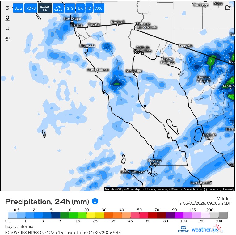 Detalló que para este día se prevé un cielo de medio nublado a nublado, con probabilidad de precipitaciones ligeras durante el mediodía y la tarde. Estas lluvias tendrán mayor énfasis en los municipios de Ensenada y San Quintín, con la posibilidad de registrarse intervalos de chubascos acompañados de descargas eléctricas en las sierras centrales de Baja California.