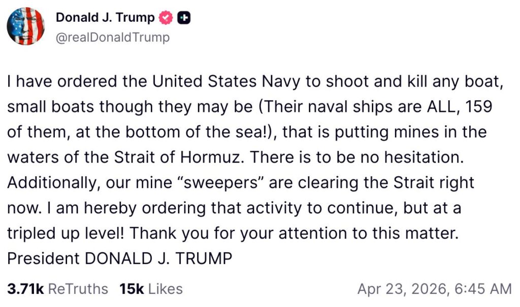 IRÁN, 23 de abril del 2026.- El presidente de EE.UU, Donald Trump, anunció que dio orden a la Armada para que abra fuego contra cualquier embarcación que coloque minas navales en el estrecho de Ormuz, al tiempo que ha afirmado que Washington trabaja “en estos momentos” para retirar las que ya han sido depositadas.