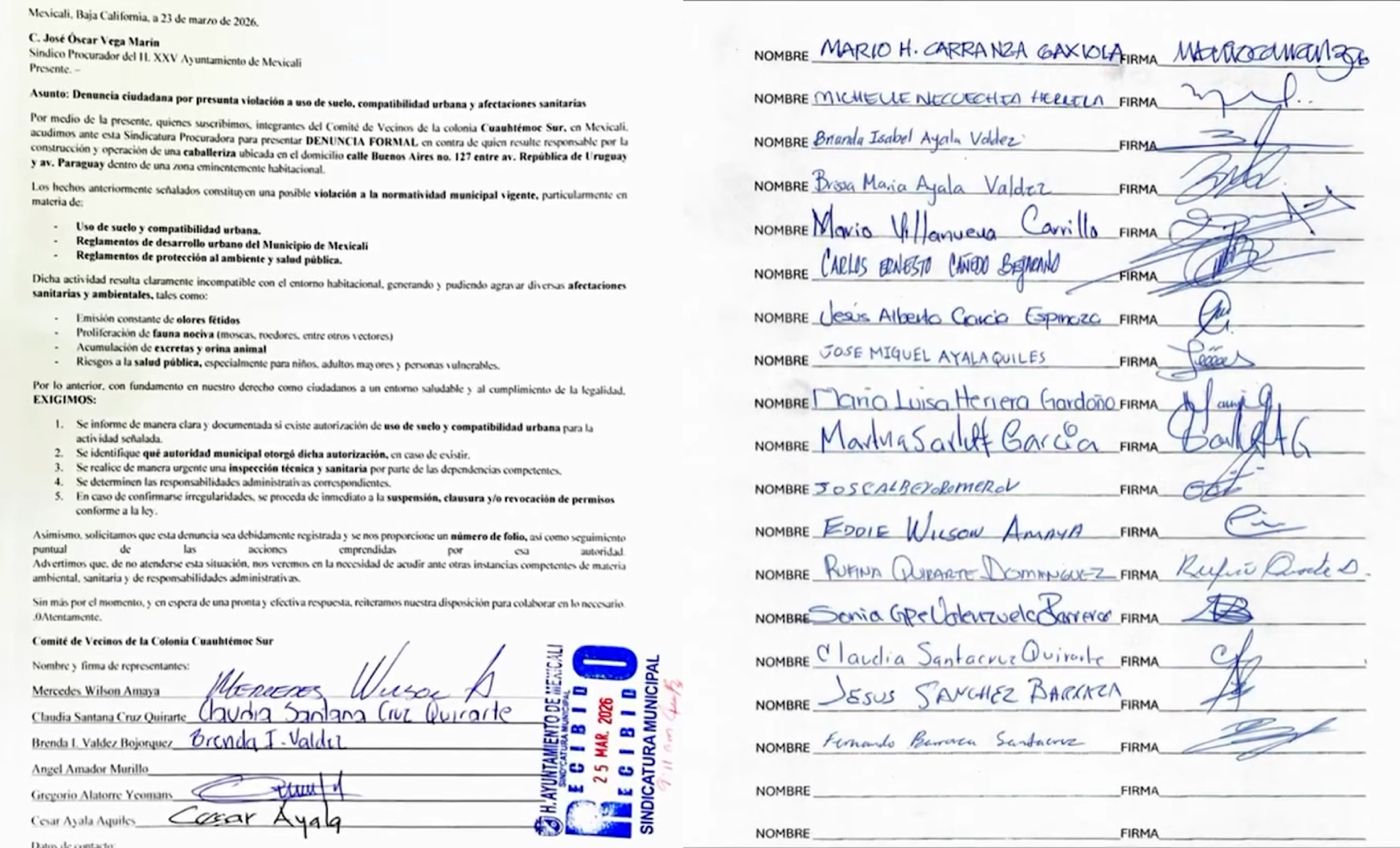 MEXICALI, Baja California, 16 de abril del 2026.- Medios mexicalenses aseguran que vecinos de la colonia Cuauhtémoc Sur interpusieron una denuncia ante la Sindicatura Municipal para evitar la construcción de una caballeriza en un predio de la calle Buenos Aires, entre las avenidas República de Uruguay y Paraguay.