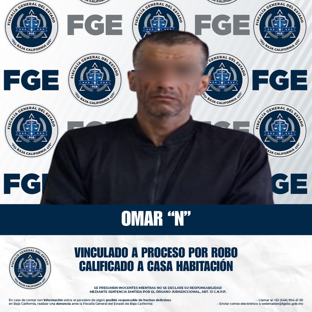 ENSENADA, Baja California a 26 de marzo de 2026, La Fiscalía Regional de Ensenada informa que, derivado del trabajo de investigación realizado por la Unidad de Robos, se obtuvo auto de vinculación a proceso en contra de Omar “N”, por su presunta participación en el delito de robo a casa habitación. Asimismo, la autoridad judicial impuso como medida cautelar la prisión preventiva, en tanto se desarrolla el proceso penal correspondiente.