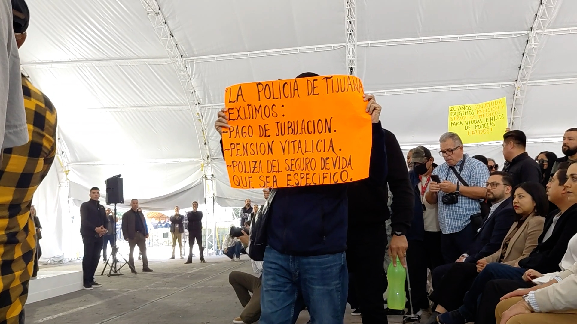 TIJUANA, Baja California, 24 de febrero de 2026.- El evento del Día de la Bandera realizado por el Ayuntamiento de Tijuana pasó de una asamblea ordinaria a los gritos de exigencia por parte de elementos policiacos retirados y viudas de uniformados, quienes exigen pensiones y servicios médicos justos para ellos, ya que desde que sus parejas cayeron en servicio, no han recibido apoyo. El presidente de la Asociación de Policías Retirados en Tijuana, Arturo Zavala, señaló que desde administraciones pasadas han tocado puertas sin obtener solución y que incluso en campaña el alcalde prometió atender el problema, pero que hasta la fecha no han tenido ninguna respuesta.